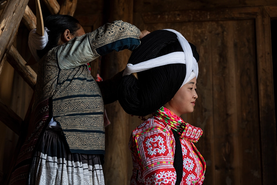 Ver a las mujeres Long Horn Miao caminar entre casas de madera oscura con esos enormes peinados llenos de historia, escuchar cómo explican que parte de ese cabello pertenece a sus antepasados y observar la técnica con la que lo arman, es una de esas experiencias que justifican cada kilómetro recorrido para llegar hasta allí.