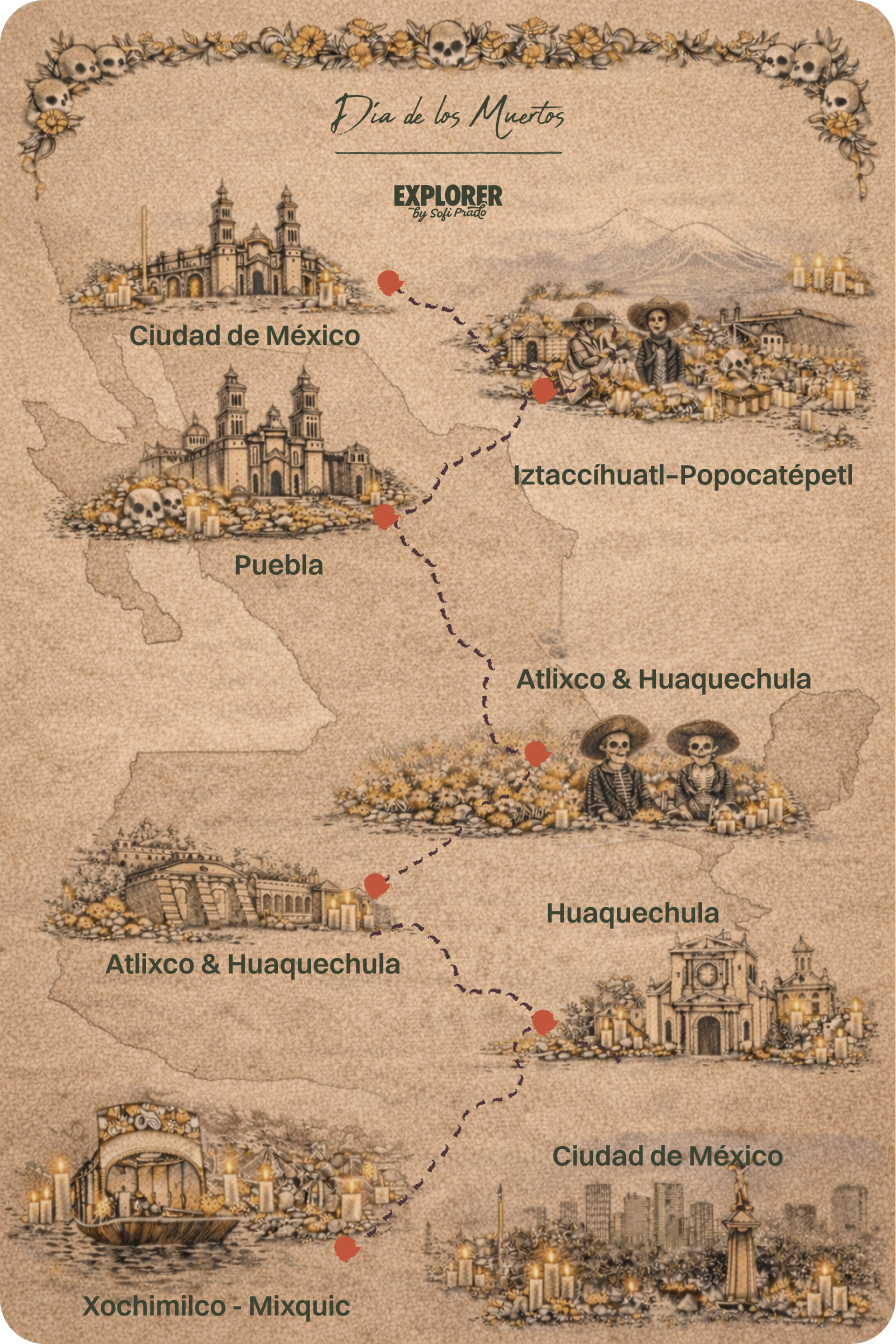 Durante el Día de Muertos caminaremos entre ofrendas, navegaremos Xochimilco al atardecer y viviremos La Alumbrada en el panteón de Mixquic, que según mi experiencia personal es uno de los lugares más mágicos y conmovedores para atravesar esta celebración.